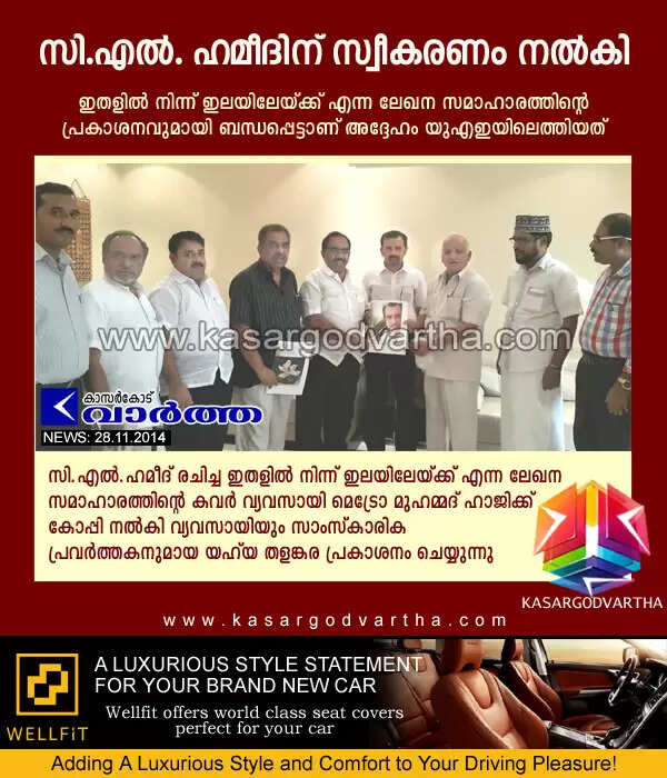 ദുബൈ: (www.kasargodvartha.com 27.11.2014) കാസര്കോട്ടെ സാംസ്കാരിക പ്രവര്ത്തകന് സി.എല്. ഹമീദിന് നാട്ടുകാരും സുഹൃത്തുക്കളും സ്വീകരണം നല്കി. ഇതളില് നിന്ന് ഇലയിലേയ്ക്ക് എന്ന ലേഖന സമാഹാരത്തിന്റെ പ്രകാശനവുമായി ബന്ധപ്പെട്ടാണ് അദ്ദേഹം യുഎഇയിലെത്തിയത്.