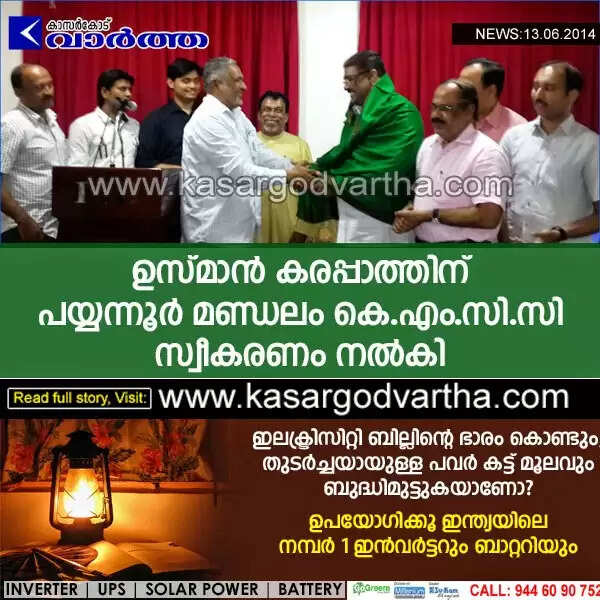 ഉസ്മാന് കരപ്പാത്തിന് പയ്യന്നൂര് മണ്ഡലം കെ.എം.സി.സി സ്വീകരണം നല്കി