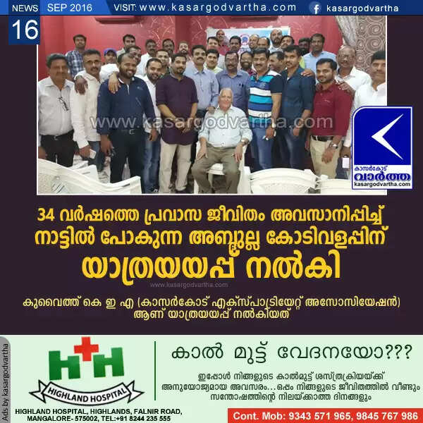 (www.kasargodvartha.com 16/09/2016) 34 വര്ഷത്തെ പ്രവാസ ജിവിതം അവസാനിപ്പിച്ച് നാട്ടില് പോകുന്ന അബ്ദുല്ല കോടിവളപ്പിന് കുവൈത്ത് കെ ഇ എ (കാസര്കോട് എക്സ്പാട്രിയേറ്റ് അസോസിയേഷന്) നല്ക്കിയ യാത്രായപ്പ്