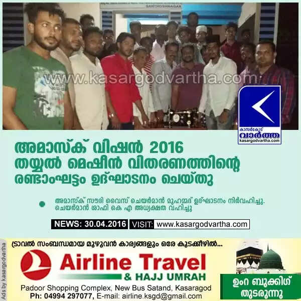 സന്തോഷ് നഗര്‍: (www.kasargodvartha.com 30.04.2016) അമാസ്‌ക് വിഷന്‍ 2016 ന്റെ സ്വയം തൊഴില്‍ പദ്ധതിയുടെ ഭാഗമായ തയ്യല്‍ മെഷീന്‍ വിതരണത്തിന്റെ രണ്ടാം ഘട്ട ഉദ്ഘാടനം അമാസ്‌ക് സൗദി വൈസ് ചെയര്‍മാന്‍ മുഹമ്മദ് നിര്‍വഹിച്ചു. ചെയര്‍മാന്‍ ശാഫി കെ എ അധ്യക്ഷത വഹിച്ചു.