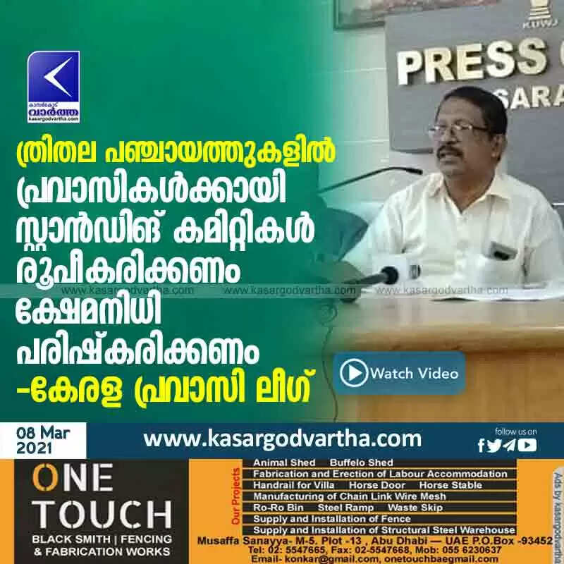 Keywords: Kasaragod, Kerala, News, Pravasi League, Committee, Panchayath, Welfare fund, State- Committee, Pension, Gulf, Education, Fine, Leader, Press meet, Standing committees for expatriates should be formed in the panchayats; Welfare Fund should be reformed - Kerala Pravasi League.