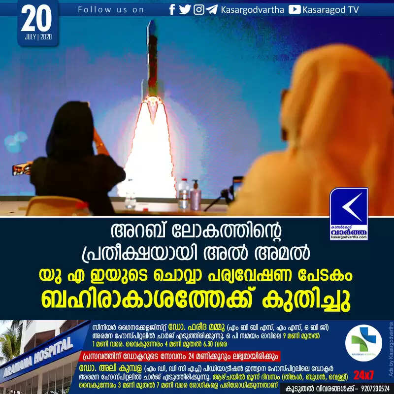 അറബ് ലോകത്തിന്റെ പ്രതീക്ഷയായി അല്‍ അമല്‍; യു എ ഇയുടെ ചൊവ്വാ പര്യവേഷണ പേടകം ബഹിരാകാശത്തേക്ക് കുതിച്ചു