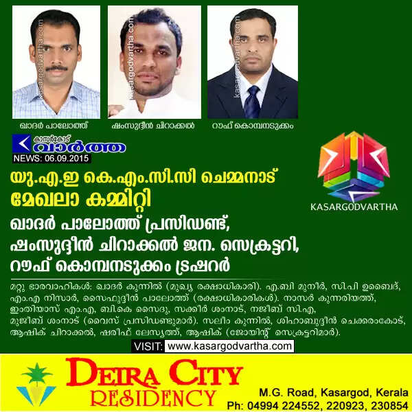യു.എ.ഇ കെ.എം.സി.സി ചെമ്മനാട് മേഖലാ കമ്മിറ്റി: ഖാദര്‍ പാലോത്ത് പ്രസിഡണ്ട്, ഷംസുദ്ദീന്‍ ചിറാക്കല്‍ ജന. സെക്രട്ടറി, റൗഫ് കൊമ്പനടുക്കം ട്രഷറര്‍