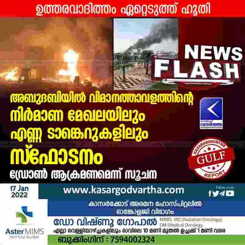 അബുദബിയില് വിമാനത്താവളത്തിന്റെ നിര്മാണ മേഖലയിലും എണ്ണ ടാങ്കെറുകളിലും സ്ഫോടനം; ഡ്രോൺ ആക്രമണമെന്ന് സൂചന; ഉത്തരവാദിത്തം ഏറ്റെടുത്ത് ഹൂതി