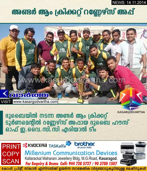 (www.kasargodvartha.com 14.11.2014) ദുബൈയില്‍ നടന്ന അണ്ടര്‍ ആം ക്രിക്കറ്റ് ടൂര്‍ണമെന്റില്‍ റണ്ണേഴ്‌സ് അപ്പായ ദുബൈ ഹൗസ് ഓഫ് ഇ.വൈ.സി.സി എരിയാല്‍ ടീം