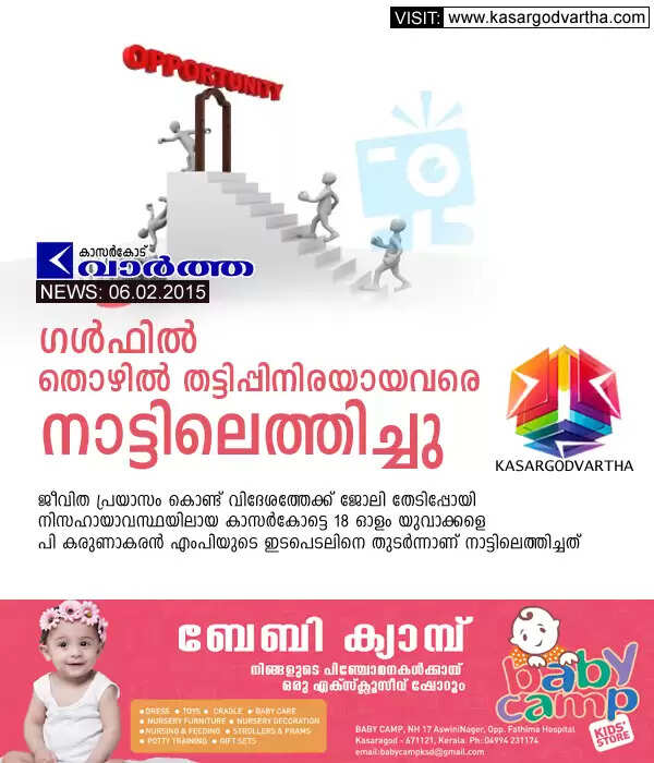 കാസര്കോട്: (www.kasargodvartha.com 06/02/2015) ഗള്ഫില് തൊഴില് തട്ടിപ്പിനിരയായവരെ പി. കരുണാകരന് എം.പിയുടെ ഇടപെടലിനെ തുടര്ന്ന് നാട്ടിലെത്തിച്ചു.