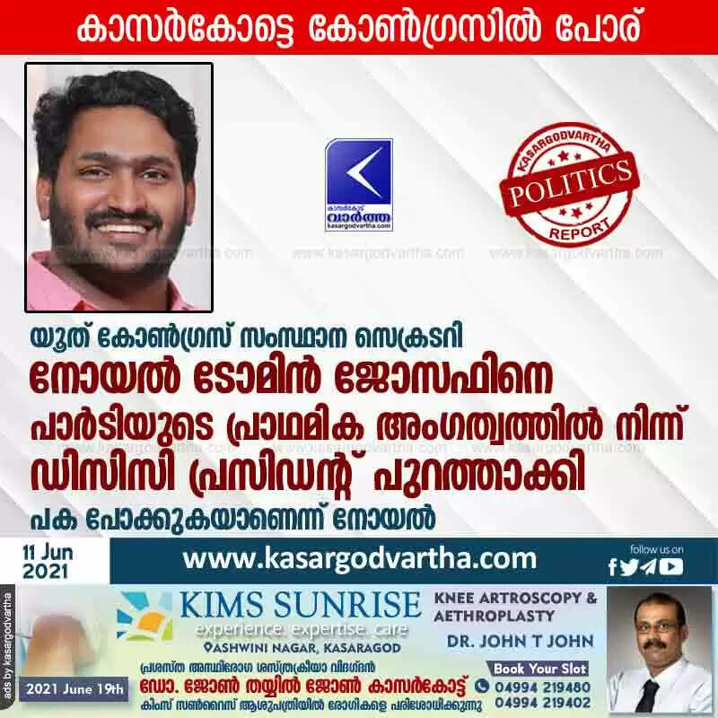 Keywords: Kanhangad, Kasaragod, Kerala, News, Youth-Congress, Congress, DCC, KPCC-president, K.Sudhakaran-MP, Leader, Political party, President, Gulf, Social-Media, Periya, Hakeem Kunnil, Youth Congress state secretary Noel Tomin Joseph expelled from party.