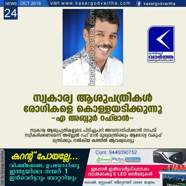 സ്വകാര്യ ആശുപത്രികള്‍ രോഗികളെ കൊള്ളയടിക്കുന്നു: എ അബ്ദുര്‍ റഹ് മാന്‍
