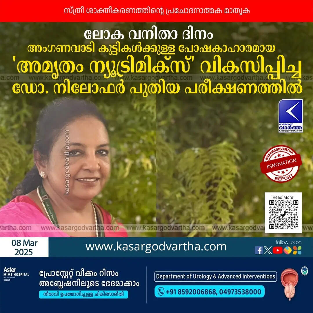 Innovation | ലോക വനിതാ ദിനം: അംഗണവാടി കുട്ടികൾക്കുള്ള പോഷകാഹാരമായ 'അമൃതം ന്യൂട്രിമിക്സ്' വികസിപ്പിച്ച ഡോ. നിലോഫർ പുതിയ പരീക്ഷണത്തിൽ