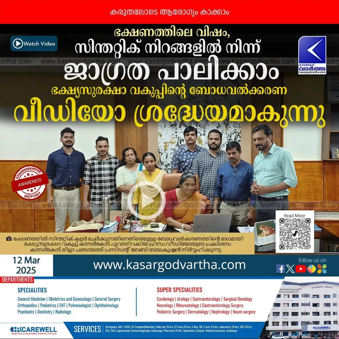 The Kasaragod Food Safety Department has released a video raising awareness about the harmful effects of synthetic colors in food, urging people to avoid their usage.