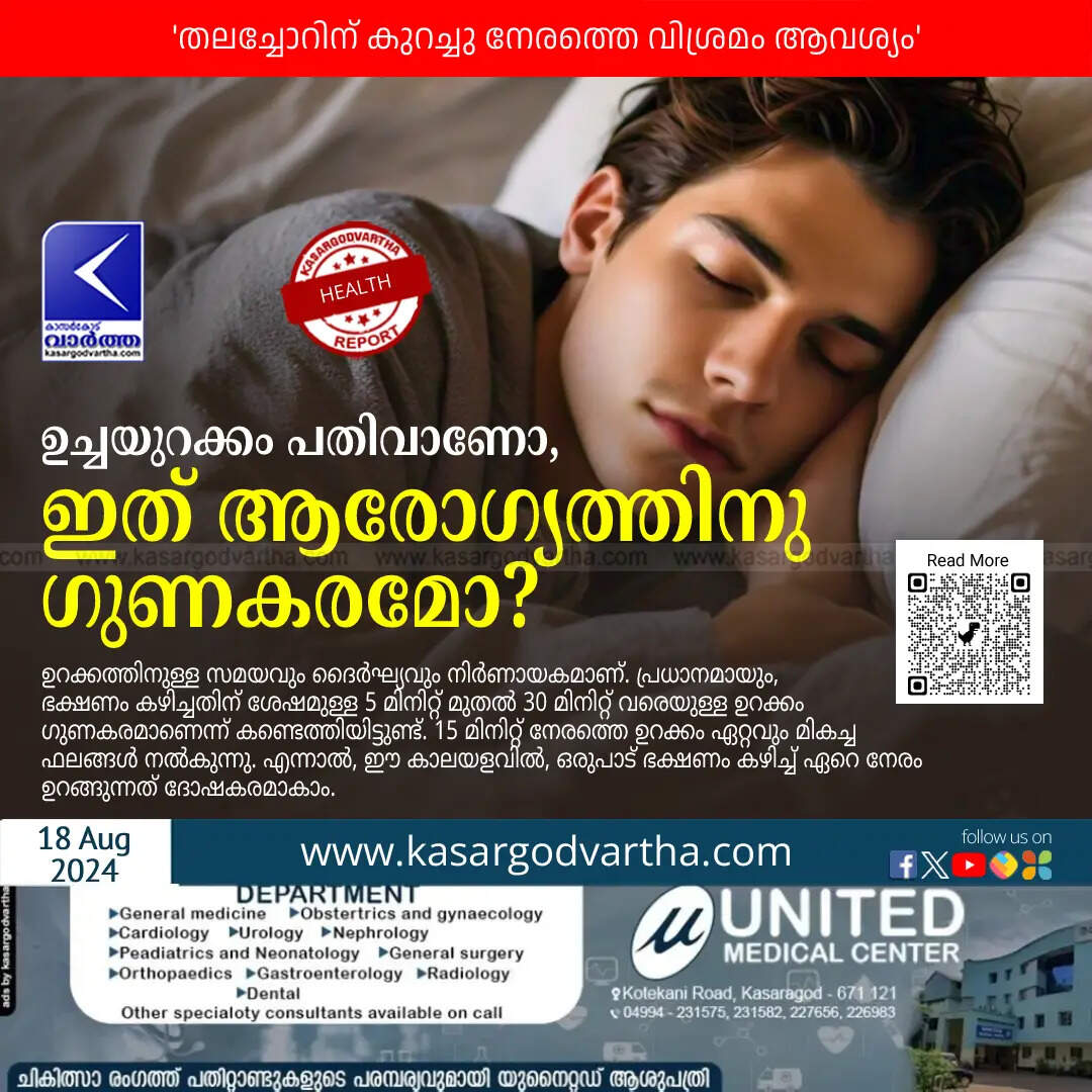 ന്യൂഡൽഹി: (KasargodVartha) ഉച്ചയുറക്കം ഇത് ആരോഗ്യത്തിനു നല്ലതാണോ? പലർക്കും ഈ ചോദ്യങ്ങൾ സംശയങ്ങളാവാറുണ്ട്. ഭക്ഷണം കഴിച്ച് ഉറങ്ങാൻ പോകുന്ന ശീലമുള്ള ചില കുടുംബങ്ങളിൽ ഈ പ്രശ്നം പ്രത്യേകിച്ച് ശ്രദ്ധേയമാണ്. എന്നാൽ, ഉച്ചയുറക്കം ആരോഗ്യഗുണങ്ങളും ദോഷങ്ങളും സംബന്ധിച്ച് നടത്തിയ പഠനങ്ങൾ വിശദമായ ഉത്തരങ്ങൾ നൽകുന്നു.