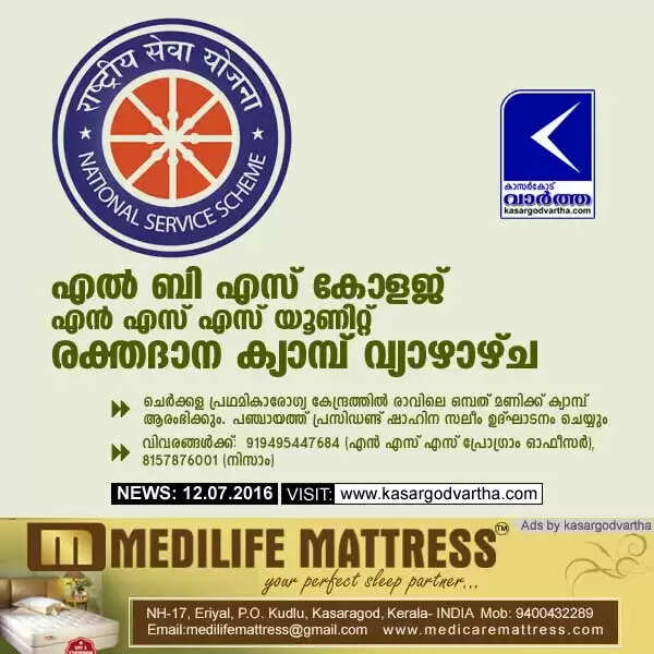 പൊവ്വല്: (www.kasargodvartha.com 12/07/2016) എല് ബി എസ് എഞ്ചിനീയറിംഗ് കോളജ് എന് എസ് എസ് യൂണിറ്റ് രക്തദാന ക്യാമ്പ് സംഘടിപ്പിക്കുന്നു. ചെര്ക്കള പ്രഥമികാരോഗ്യ കേന്ദ്രത്തില് വ്യാഴാഴ്ച രാവിലെ ഒമ്പത് മണിക്ക് ക്യാമ്പ് ആരംഭിക്കും. പഞ്ചായത്ത് പ്രസിഡണ്ട് ഷാഹിന സലീം ക്യാമ്പ് ഉദ്ഘാടനം ചെയ്യും.