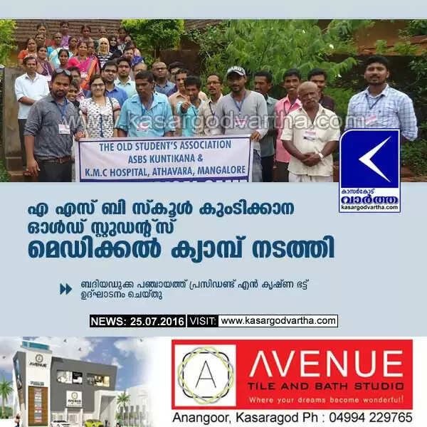 ബദിയഡുക്ക: (www.kasargodvartha.com 25.07.2016) എ എസ് ബി സ്കൂള് കുംടിക്കാന ഓള്ഡ് സ്റ്റുഡന്റ്സും മംഗളൂരു കെ എം സി അത്താവര് ആശുപത്രിയും സംയുക്തമായി നടത്തിയ മെഡിക്കല് ക്യാമ്പില് 500 ലധികം ആളുകള് പങ്കെടുത്തു. പഞ്ചായത്ത് പ്രസിഡണ്ട് എന് കൃഷ്ണ ഭട്ട് ഉദ്ഘാടനം ചെയ്തു.