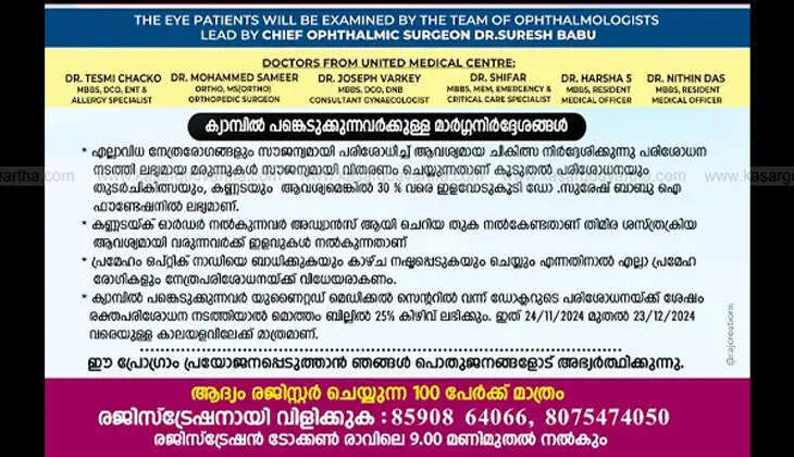 ഇത് സൗജന്യമായി നേത്രരോഗങ്ങൾ മുതൽ പൊതുവായ ആരോഗ്യ പ്രശ്നങ്ങൾ വരെ പരിശോധിക്കാൻ അവസരം നൽകുന്നു എന്നതാണ് ക്യാമ്പിൻ്റെ പ്രാധാന്യം. ഡോ. സുരോഷ് ബാബു ഐ ഫൗണ്ടേഷനിലെയും യുനൈറ്റെഡ് ആശുപത്രിയിലെയും വിദഗ്ധരാണ് പരിശോധന നടത്തുക എന്നതും ഇതിന്റെ പ്രത്യേകതയാണ്. പ്രത്യേകിച്ചും ആരോഗ്യ സൗകര്യങ്ങൾ ലഭ്യമല്ലാത്തവർക്ക് ഈ ക്യാമ്പ് വളരെ ഉപകാരപ്രദമാകും. കൂടാതെ, രോഗങ്ങൾ നേരത്തേ കണ്ടെത്തി ചികിത്സിക്കുന്നതിന്റെ പ്രാധാന്യത്തെക്കുറിച്ചുള്ള ബോധവൽക്കരണവും ഈ ക്യാമ്പിലൂടെ ലഭിക്കും.