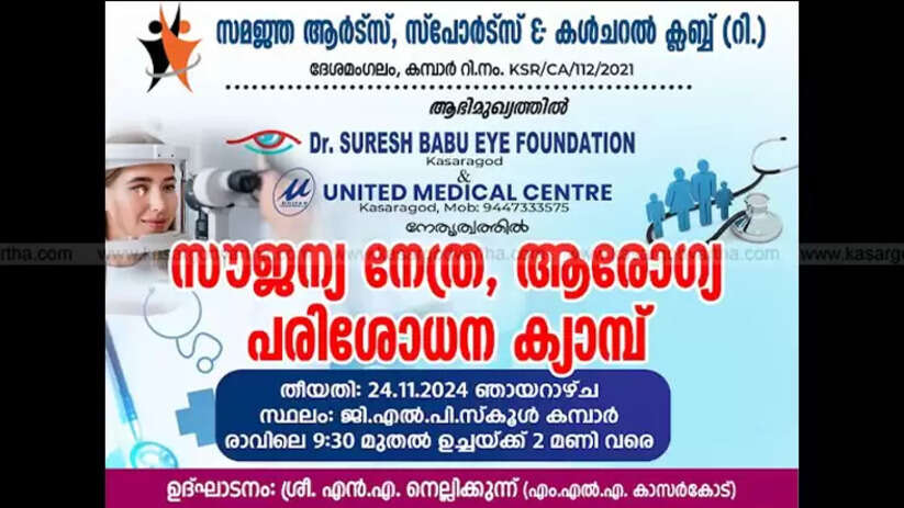 കമ്പാർ: (KasargodVartha) സമൂഹത്തിന്റെ ആരോഗ്യ സുരക്ഷയ്ക്ക് മുന്നിൽ നിൽക്കുന്ന സമജ്ഞ ആർട്സ്, സ്പോർട്സ് & കള്ചറല് ക്ലബ്ബ് വീണ്ടും മികച്ചൊരു സംരംഭം ഒരുക്കുന്നു. ഡോ. സുരോഷ് ബാബു ഐ ഫൗണ്ടേഷന്റെയും യുണൈറ്റഡ് മെഡിക്കൽ സെന്ററിന്റെയും സഹകരണത്തോടെ നേത്ര, ആരോഗ്യ സൗജന്യ പരിശോധന ക്യാമ്പ് ആണ് സംഘടിപ്പിക്കുന്നത്.