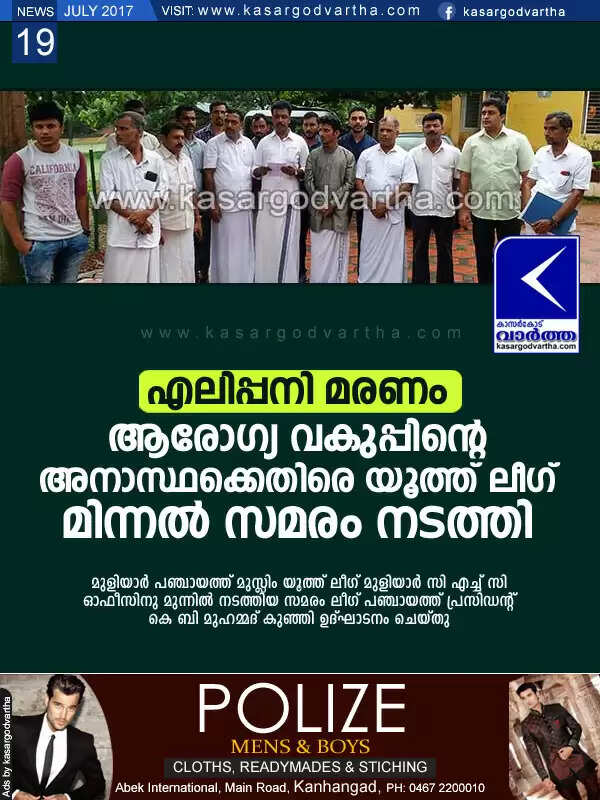മുളിയാര്‍: (www.kasargodvartha.com 19/07/2017) പല വിധ പനിയും, പകര്‍ച്ചവ്യാധിയും പടര്‍ന്നു പിടിക്കുകയും എലിപ്പനി ബാധിച്ച് മൊയ്തീന്‍ കുഞ്ഞി എന്ന യുവാവ് മരിക്കാനിടവന്നിട്ടും പ്രതിരോധ പ്രവര്‍ത്തനങ്ങളോ, ബോധവല്‍ക്കരണമോ നടത്താത്ത ആരോഗ്യ വകുപ്പിനെതിരെ മുളിയാര്‍ പഞ്ചായത്ത് മുസ്ലിം യൂത്ത് ലീഗ് മുളിയാര്‍ സി എച്ച് സി ഓഫീസിനു മുന്നില്‍ മിന്നല്‍ സമരം നടത്തി. മണ്‍സൂണ്‍ കാലത്തെ ആദ്യ എലിപ്പ മരണം നടന്ന മുളിയാറില്‍ ജില്ലാ മെഡിക്കല്‍ ഓഫീസര്‍ സന്ദര്‍ശനം നടത്താത്ത നടപടി നിരുത്തരവാദപരമാണ്.