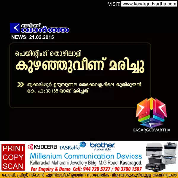 തൃക്കരിപ്പൂര്: (www.kasargodvartha.com 21/02/2015) പെയിന്റിംഗ് തൊഴിലാളി കുഴഞ്ഞുവീണ് മരിച്ചു. ഉടുമ്പുന്തല തെക്കേവളപ്പിലെ കുതിരുമ്മല് കെ. ഹംസ (65)യാണ് മരിച്ചത്. ശനിയാഴ്ച ഉച്ചയ്ക്ക് ഉടുമ്പുന്തല ജംങ്ഷനിലെ കടയില് നിന്നും സാധനം വാങ്ങുന്നതിനിടെയാണ് കുഴഞ്ഞ് വീണത്.