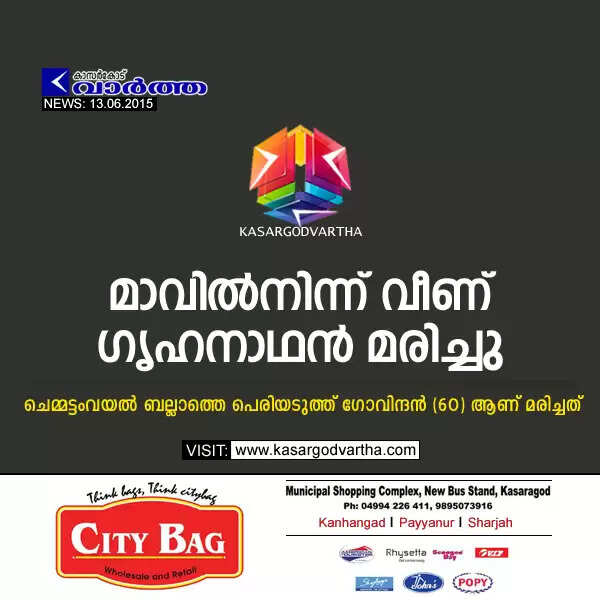 കാഞ്ഞങ്ങാട്: (www.kasargodvartha.com 13/06/2015) മാവില്‍നിന്ന് വീണ് ഗൃഹനാഥന്‍ മരിച്ചു. ചെമ്മട്ടംവയല്‍ ബല്ലാത്തെ പെരിയടുത്ത് ഗോവിന്ദന്‍ (60) ആണ് മരിച്ചത്. ഹൊസ്ദുര്‍ഗിലെ വീട്ടുപറമ്പില്‍ നിന്ന് മാങ്ങപറിക്കുന്നതിനിടെ വഴുതി വീഴുകയായിരുന്നു. വെള്ളിയാഴ്ച ഉച്ചയോടെയാണ് അപകടം സംഭവിച്ചത്.