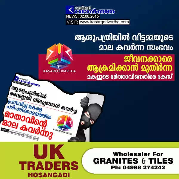 കാഞ്ഞങ്ങാട്: (www.kasargodvartha.com 02/08/2015) തോയമ്മല്‍ ജില്ലാ ആശുപത്രിയില്‍ പരിചരണത്തിനെത്തിയ സ്ത്രീയുടെ സ്വര്‍ണ്ണമാല കവര്‍ന്ന സംഭവത്തില്‍ പ്രകോപിതനായി ആശുപത്രി ജീവനക്കാരെ ആക്രമിക്കാന്‍ മുതിരുകയും അസഭ്യം പറയുകയും ചെയ്തതിന് സ്ത്രീയുടെ മകളുടെ ഭര്‍ത്താവിനെതിരെ പോലീസ് കേസെടുത്തു. ജില്ലാ ആശുപത്രി സൂപ്രണ്ടിന്റെ പരാതിയില്‍ തച്ചങ്ങാട് അരവത്തെ രാജേഷിനെതിരെയാണ് പോലീസ് കേസെടുത്തത്.