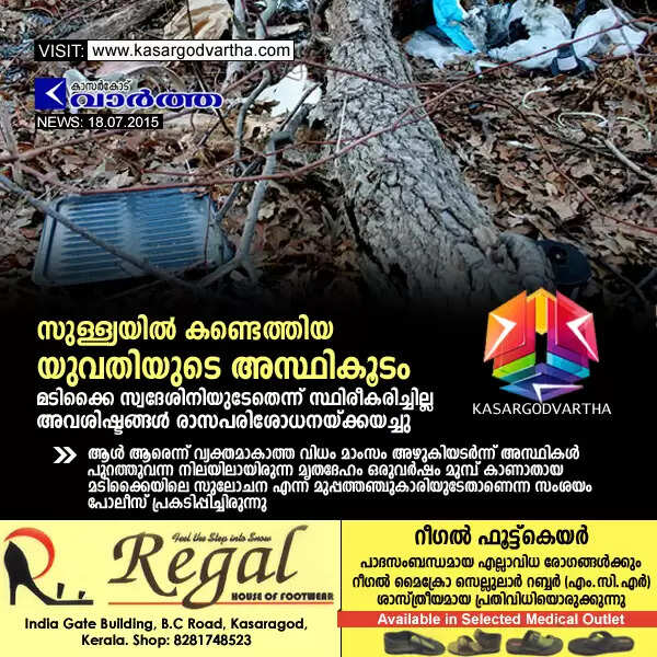 സുള്ള്യയില് കണ്ടെത്തിയ യുവതിയുടെ അസ്ഥികൂടം മടിക്കൈ സ്വദേശിനിയുടേതെന്ന് സ്ഥിരീകരിച്ചില്ല; അവശിഷ്ടങ്ങള് രാസപരിശോധനയ്ക്കയച്ചു