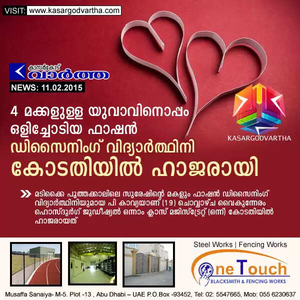 കാഞ്ഞങ്ങാട്: (www.kasargodvartha.com 11/02/2015) നാല് മക്കളുള്ള യുവാവിനൊപ്പം ഒളിച്ചോടിയ 19 കാരി കോടതിയില് ഹാജരായി. മടിക്കൈ പൂത്തക്കാലിലെ സുരേഷിന്റെ മകളും ഫാഷന് ഡിസൈനിംഗ് വിദ്യാര്ത്ഥിനിയുമായ പി കാവ്യയാണ് (19) ചൊവ്വാഴ്ച വൈകുന്നേരം ഹൊസ്ദുര്ഗ് ജുഡീഷ്യല് ഒന്നാം ക്ലാസ് മജിസ്ട്രേറ്റ് (ഒന്ന്) കോടതിയില് ഹാജരായത്.