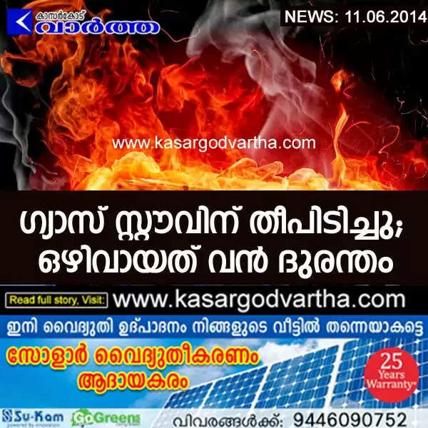 കാഞ്ഞങ്ങാട്: (www.kasargodvartha.com 11.06.2014) ഗ്യാസ് സ്റ്റൗവിന് തീപിടിച്ചത് വീട്ടുകാരെ പരിഭ്രാന്തിയിലാഴ്ത്തി. കൊവ്വല്‍പ്പള്ളി പെട്രോള്‍ പമ്പിനടുത്ത തേയില വ്യാപാരി എം.പി അഹമ്മദ് ഹാജിയുടെ വീട്ടില്‍ ചൊവ്വാഴ്ച രാത്രി 11 മണിയോടെയായിരുന്നു സംഭവം.