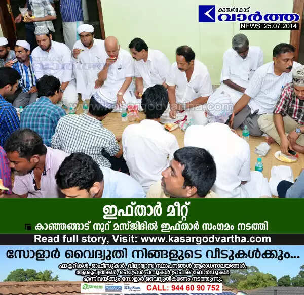 (www.kasargodvartha.com 25.07.2014) കാഞ്ഞങ്ങാട് നൂറ് മസ്ജിദില്‍ നടന്ന ഇഫ്താര്‍ സംഗമത്തില്‍ നിന്ന്. ജമാഅത്ത് പ്രസിഡന്റ് മെട്രോ മുഹമ്മദ് ഹാജി, വൈസ് പ്രസിഡന്റ് പി. മുഹമ്മദ് കുഞ്ഞി മാസ്റ്റര്‍, ഖത്തീബ് കീച്ചേരി അബ്ദുല്‍ ഗഫൂര്‍ മൗലവി, ഭാരവാഹികളായ പാലക്കി ഹസൈനാര്‍, കെ.എച്ച് മുഹമ്മദ് കുഞ്ഞി, മജീദ്, കോപ്പട്ടി മുഹമ്മദ് കുഞ്ഞി തുടങ്ങിയവര്‍ സംബന്ധിച്ചു.