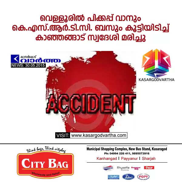 വെള്ളൂരില് പിക്കപ്പ് വാനും കെ.എസ്.ആര്.ടി.സി. ബസും കൂട്ടിയിടിച്ച് കാഞ്ഞങ്ങാട് സ്വദേശി മരിച്ചു