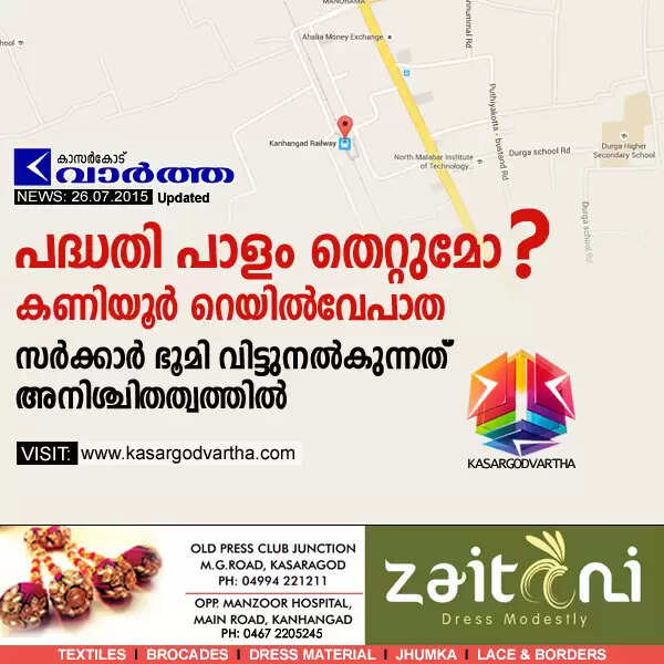 കാസര്‍കോട്: (www.kasargodvartha.com 26/07/2015) കണിയൂര്‍ റെയില്‍വേപാതയുടെ പദ്ധതിക്കായി സര്‍ക്കാര്‍ ഭൂമി വിട്ടുനല്‍കുന്നത്് അനിശ്ചിതത്വത്തില്‍. കേരളത്തിലെ റെയില്‍വേ പാതയ്ക്കുവേണ്ട ഭൂമി ഏറ്റെടുക്കല്‍ സംബന്ധിച്ച് നിയമസഭയില്‍ കെ കുഞ്ഞിരാമന്‍ എം.എല്‍.എ ഉയര്‍ത്തിയ സബിമിഷന് മറുപടിയായിക്കൊണ്ടാണ് റെയില്‍വേയുടെ ചുമതലയുള്ള മന്ത്രി ആര്യാടന്‍ മുഹമ്മദ് ഇക്കാര്യം വെളിപ്പെടുത്തിയത്.