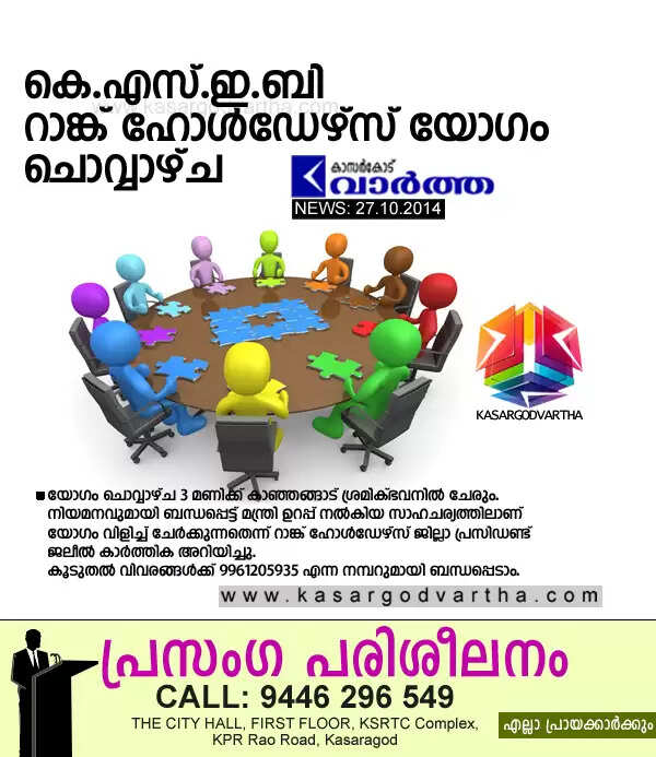 കാഞ്ഞങ്ങാട്: (www.kasargodvartha.com 27.10.2014) കാസര്കോട് ജില്ലയിലെ കെ.എസ്.ഇ.ബി മസ്ദൂര് റാങ്ക് പട്ടികയില് ഉള്പെട്ടിട്ടുള്ളവരുടെ യോഗം ഒക്ടോബര് 28 ചൊവ്വാഴ്ച 3 മണിക്ക് കാഞ്ഞങ്ങാട് ശ്രമിക്ഭവനില് ചേരും.