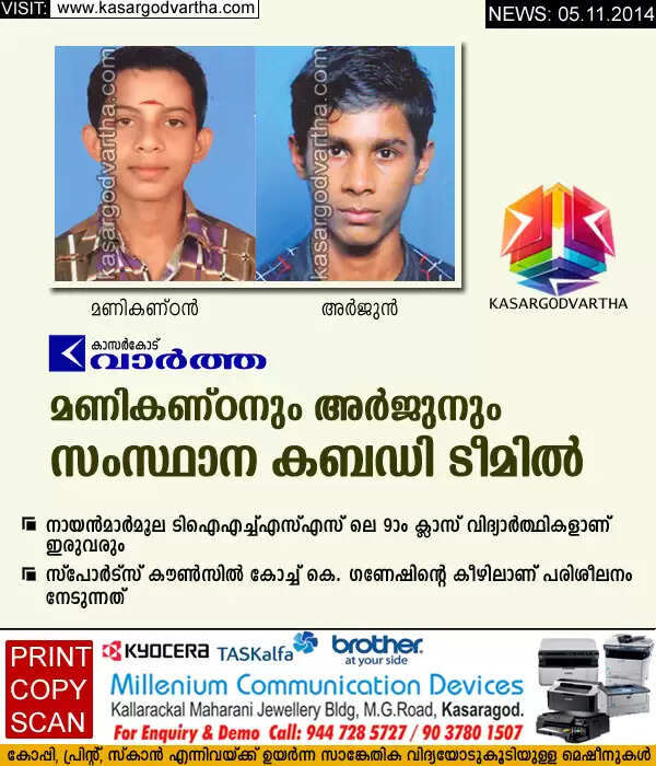 Keywords : Kasaragod, Kabaddi-Team, State, Selection, Kanhangad, Students, Arjun, Manikandan, Manikandan and Arjun selected in State Kabaddi team.