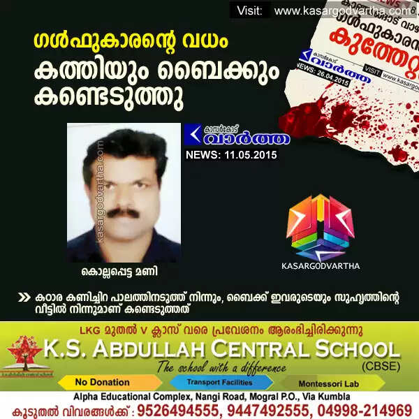 കാഞ്ഞങ്ങാട്: (www.kasargodvartha.com 11/05/2015) വാഴുന്നോറടിയില് ഗള്ഫുകാരനായ മണിയെ (40) കുത്തികൊലപ്പെടുത്താന് ഉപയോഗിച്ച കഠാരയും, പ്രതികള് ഉപയോഗിച്ച ബൈക്കും പോലീസ് കണ്ടെടുത്തു. കഠാര കണിച്ചിറ പാലത്തിനടുത്ത് നിന്നും, ബൈക്ക് ഇവരുടെയും സുഹൃത്തിന്റെ വീട്ടില് നിന്നുമാണ് കണ്ടെടുത്തത്.