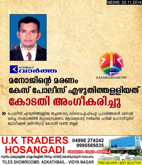 Keywords : Kanhangad, Police, Case, court, Bekal, Thachangad, Kerala, Manoj, Death, MYL, Manoj's death: court upholds Police report.