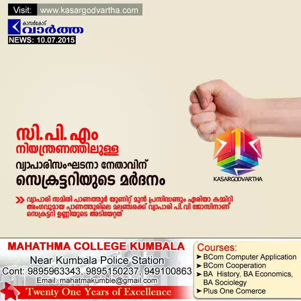 കാഞ്ഞങ്ങാട്: (www.kasargodvartha.com 10/07/2015) സി.പി.എം നിയന്ത്രണത്തിലുള്ള കേരള വ്യാപാരി വ്യവസായി സമിതി മുന് പ്രസിഡണ്ടിനെ സെക്രട്ടറി കടയില് കയറി മര്ദിച്ചു. വ്യാപാരി സമിതി പാണത്തൂര് യൂണിറ്റ് മുന് പ്രസിഡണ്ടും ഏരിയാ കമ്മിറ്റി അംഗവുമായ പാണത്തൂരിലെ മലഞ്ചരക്ക് വ്യാപാരി പി.വി ജോസിനാണ് സെക്രട്ടറി ഉണ്ണിയുടെ അടിയേറ്റത്.