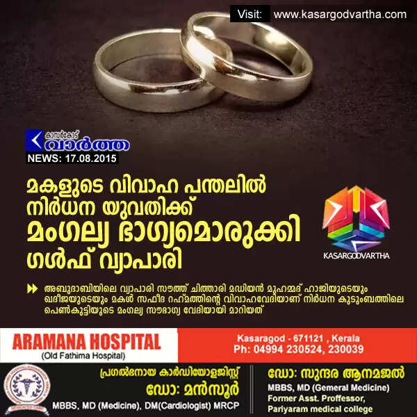 മകളുടെ വിവാഹ പന്തലില് നിര്ധന യുവതിക്ക് മംഗല്യ ഭാഗ്യമൊരുക്കി ഗള്ഫ് വ്യാപാരി