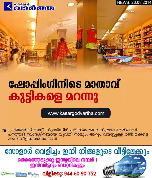തിരക്കുള്ള ഫൂട്ട്പാത്തില് അലഞ്ഞുതിരഞ്ഞു നടന്ന കുട്ടികളെ നാട്ടുകാര് കണ്ടെത്തുകയായിരുന്നു. കാര്യം തിരക്കിയപ്പോള് മാതാവിനൊപ്പം ഷോപ്പിംഗിന് വന്നതാണെന്ന് അറിയിച്ചതോടെ കുട്ടികളെ കടയിലേക്ക് കൂട്ടിക്കൊണ്ടുപോയി. പിന്നീടാണ് മാതാവും ബന്ധുവും കുട്ടിയെ തേടി വസ്ത്രാലയത്തിലേക്കെത്തിയത്. ഇതിനിടയില് മാതാവ് ഹൊസ്ദുര്ഗ് പോലീസില് പരാതിയും നല്കിയിരുന്നു.