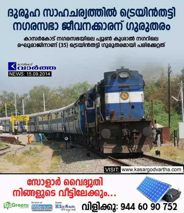 കാഞ്ഞങ്ങാട്: (www.kasargodvartha.com 15.09.2014) ദുരൂഹ സാഹചര്യത്തില്‍ ട്രെയിന്‍തട്ടി നഗരസഭാ ജീവനക്കാരന് ഗുരുതരം. കാസര്‍കോട് നഗരസഭയിലെ പ്യൂണ്‍ കുശാല്‍ നഗറിലെ രഘുരാജിനാണ് (35) ട്രെയിന്‍തട്ടി ഗുരുതരമായി പരിക്കേറ്റത്. തിങ്കളാഴ്ച രാവിലെയാണ് രഘുരാജിനെ പാളത്തിന് സമീപം ഗുരുതരമായി പരിക്കേറ്റ നിലയില്‍ കണ്ടെത്തിയത്.
