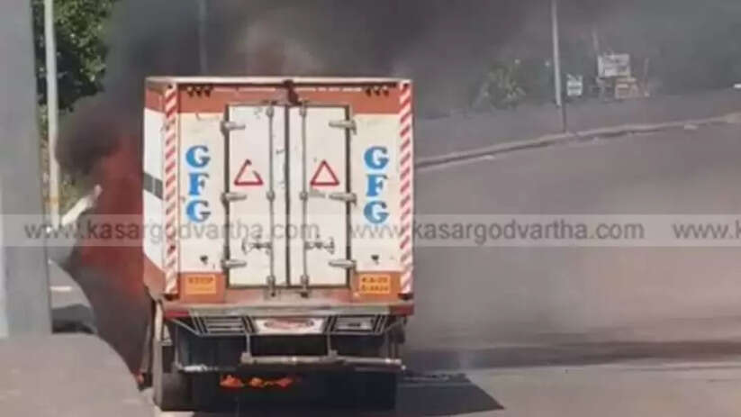 പെരിയ സെൻട്രൽ യൂണിവേഴ്സിറ്റിക്ക് സമീപം ദേശീയപാതയിൽ മീൻ ലോറിക്ക് തീ പിടിച്ചു