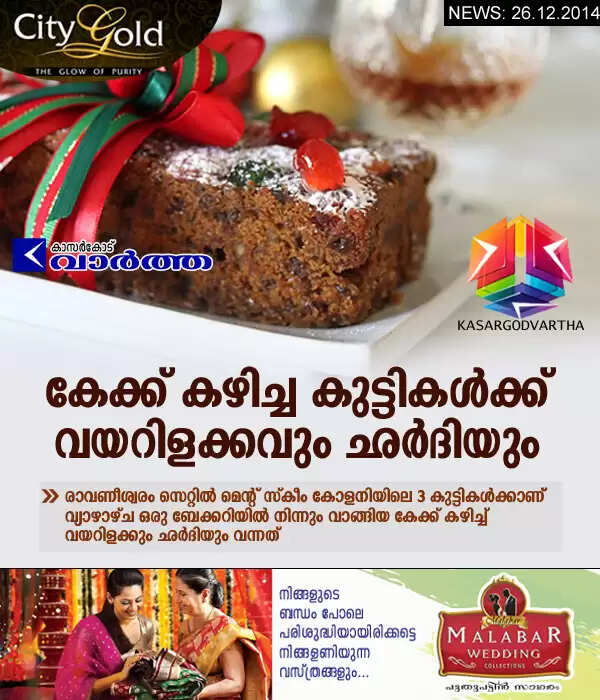 രാവണീശ്വരം: (www.kasargodvartha.com 26.12.2014) ക്രിസ്തുമസ് ദിവസം കേക്ക് കഴിച്ച കുട്ടികള്ക്ക് വയറിളക്കവും ഛര്ദിയും. രാവണീശ്വരം സെറ്റില് മെന്റ് സ്കീം കോളനിയിലെ മൂന്ന് കുട്ടികള്ക്കാണ് വ്യാഴാഴ്ച ഒരു ബേക്കറിയില് നിന്നും വാങ്ങിയ കേക്ക് കഴിച്ച് വയറിളക്കും ഛര്ദിയും വന്നത്.