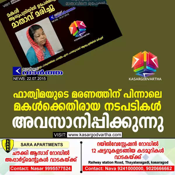 കാഞ്ഞങ്ങാട്: (www.kasargodvartha.com 22.07.2015) അസുഖം മൂര്‍ച്ഛിച്ചതിനെ തുടര്‍ന്ന് ഉദുമ പാക്യാരയിലെ മസ്താന്റെ ഭാര്യ ഫാത്വിമ എന്ന പാത്തുമ്മയെ ആശുപത്രിയില്‍ ഉപേക്ഷിച്ച് സംഭവത്തില്‍ മകള്‍ക്കെതിരായ നടപടികള്‍ പോലീസും കാഞ്ഞങ്ങാട് ആര്‍.ഡി.ഒയും അവസാനിപ്പിക്കുന്നു.