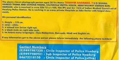 വ്യാജരേഖകള് ചമച്ച് ഇന്ത്യന് മെഡിക്കല് കൗണ്സില് ആക്ട് ലംഘിച്ച് തട്ടിപ്പ് നടത്തിയ കേസിലാണ് പോലീസ് നടപടി. 170 സെ.മീ ഉയരവും വെളുത്ത നിറവുമുളള തന്വീര് മലയാളം, ഹിന്ദി, കന്നഡ, ഇംഗ്ലീഷ് തുടങ്ങിയ ഭാഷകള് സംസാരിക്കും. വലതു കണ്ണിന് താഴെ മുറിവ് അടയാളവും കഴുത്തിന്റെ വലതുഭാഗത്ത് കറുത്ത മറുകും ഉണ്ട്.
