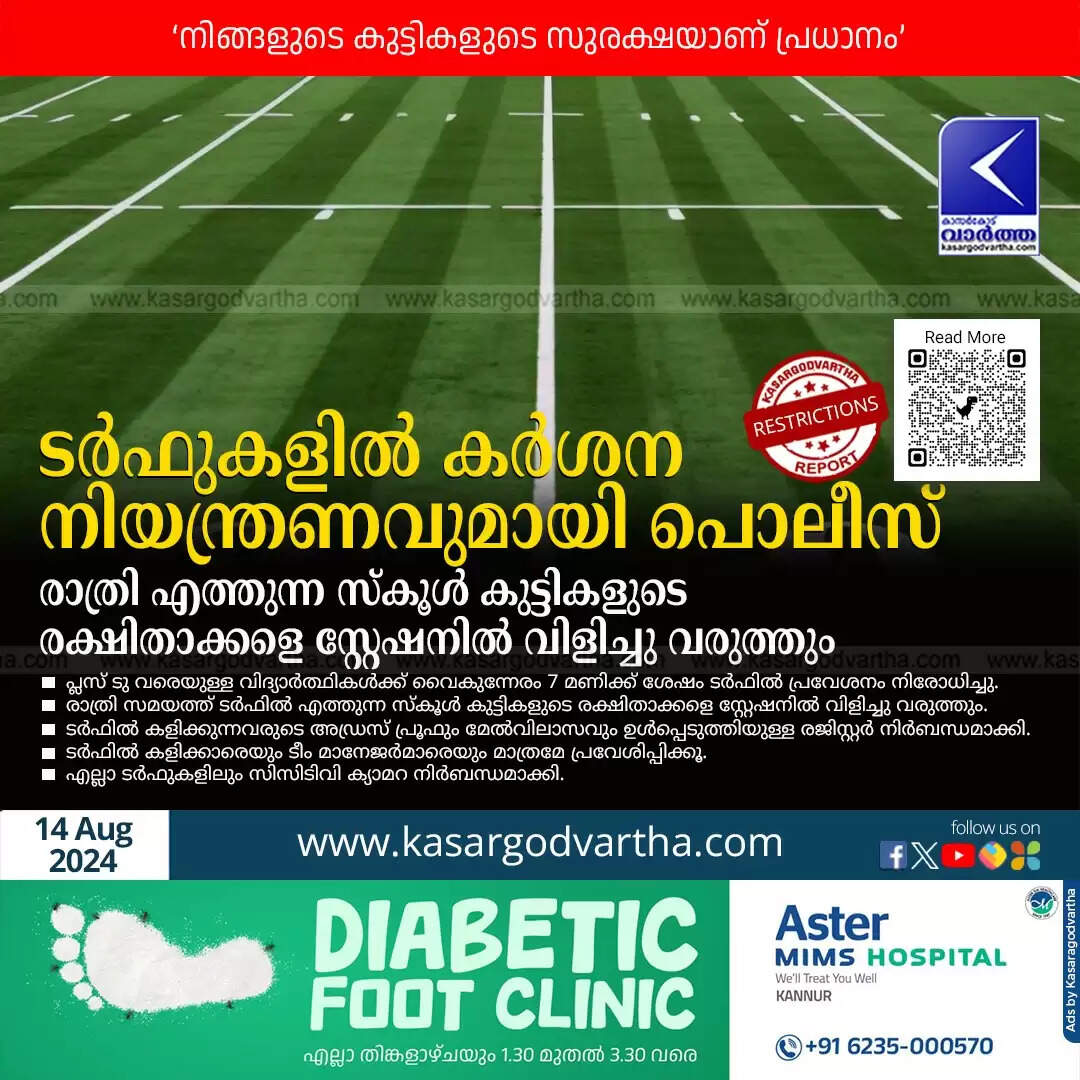 Restrictions | ടർഫുകളിൽ കർശന നിയന്ത്രണവുമായി പൊലീസ്; രാത്രി എത്തുന്ന സ്കൂൾ കുട്ടികളുടെ രക്ഷിതാക്കളെ സ്റ്റേഷനിൽ വിളിച്ചു വരുത്തും