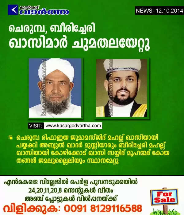 കാഞ്ഞങ്ങാട്: (www.kasargodvartha.com 12.10.2014) ചെരുമ്പ രിഫാഇയ ജുമാമസ്ജിദ് മഹല്ല് ഖാസിയായി പയ്യക്കി അബ്ദുല്‍ ഖാദര്‍ മുസ്ലിയാരും ബീരിച്ചേരി മഹല്ല് ഖാസിയായി കോഴിക്കോട് ഖാസി സയ്യിദ് മുഹമ്മദ് കോയ തങ്ങള്‍ ജമലുല്ലൈലിയും സ്ഥാനമേറ്റു. പ്രമുഖ കര്‍മ ശാസ്ത്ര പണ്ഡിതനും സൂഫി വര്യനുമായ അബ്ദുല്‍ ഖാദര്‍ മുസ്ലിയാര്‍ നിലവില്‍ പള്ളിക്കര സംയുക്ത ജമാഅത്ത് ഖാസി സ്ഥാനം വഹിക്കുന്നുണ്ട്.