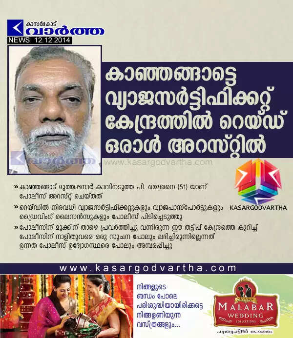 Keywords: Kasaragod, Kerala, Kanhangad, arrest, Police, Fake passport, Certificates, Police-raid, Raid for fake certificates: one arrested.
