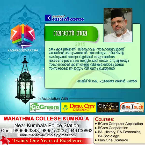 Keywords : Kasaragod, Kanhangad, Kerala, Ramadan Message, Sayyid TK Pookkoya Thangal Chandera, Advertisement Mahathma College.