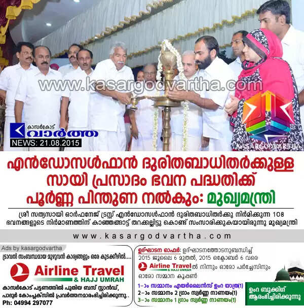 കാഞ്ഞങ്ങാട്: (www.kasargodvartha.com 21/08/2015) എന്‍ഡോസള്‍ഫാന്‍ ദുരിതബാധിതര്‍ക്കുള്ള സായി പ്രസാദം ഭവന പദ്ധതിക്ക് പൂര്‍ണ്ണ പിന്തുണ നല്‍കുമെന്ന് മുഖ്യമന്ത്രി ഉമ്മന്‍ ചാണ്ടി പറഞ്ഞു. ശ്രീ സത്യസായി ഓര്‍ഫനേജ് ട്രസ്റ്റ് എന്‍ഡോസള്‍ഫാന്‍ ദുരിതബാധിതര്‍ക്കു നിര്‍മിക്കുന്ന 108 ഭവനങ്ങളുടെ നിര്‍മാണത്തിന് കാഞ്ഞങ്ങാട്ട് തറക്കല്ലിട്ടു കൊണ്ട് സംസാരിക്കുകയായിരുന്നു മുഖ്യമന്ത്രി.