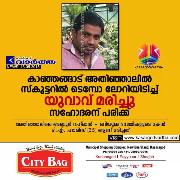 കാഞ്ഞങ്ങാട്: (www.kasargodvartha.com 13/05/2015) അതിഞ്ഞാല്‍ കോയ പള്ളിക്ക് സമീപം സ്‌കൂട്ടറില്‍ ടെമ്പോ ലോറിയിടിച്ച് യുവാവ് മരിച്ചു. സഹോദരന് പരിക്കേറ്റു. അതിഞ്ഞാലിലെ അബ്ദുര്‍ റഹ് മാന്‍ - മറിയുമ്മ ദമ്പതികളുടെ മകന്‍ ടി.എ. ഹാരിസ് (35) ആണ് മരിച്ചത്. സഹോദരന്‍ ഇബ്രാഹിമിനെ പരിക്കുകളോടെ ആശുപത്രിയില്‍ പ്രവേശിപ്പിച്ചു.