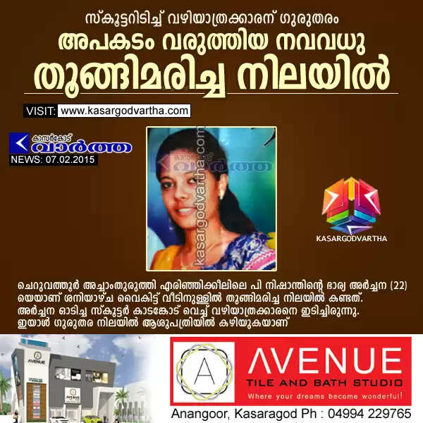 ചെറുവത്തൂര്‍: (www.kasargodvartha.com 07/02/2015) സ്‌കൂട്ടറിടിച്ച് വഴിയാത്രക്കാരന് ഗുരുതരമായി പരിക്കേറ്റതില്‍ മനംനൊന്തെന്ന് സംശയം, അപകടം വരുത്തിയ നവവധുവിനെ തൂങ്ങിമരിച്ച നിലയില്‍ കണ്ടെത്തി. ചെറുവത്തൂര്‍ അച്ചാംതുരുത്തി എരിഞ്ഞിക്കീലിലെ പി നിഷാന്തിന്റെ ഭാര്യ അര്‍ച്ചന (22)യെയാണ് ശനിയാഴ്ച വൈകിട്ട് വീടിനുള്ളില്‍ തൂങ്ങിമരിച്ച നിലയില്‍ കണ്ടത്. www.kasargodvartha.com