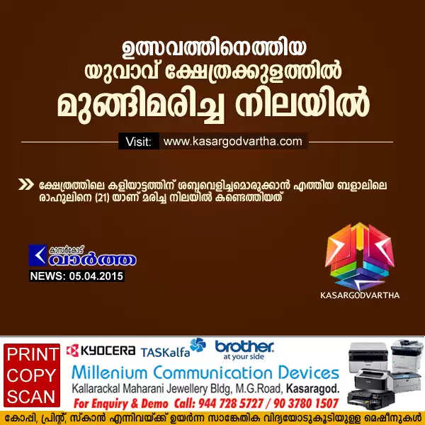 രാജപുരം: (www.kasargodvartha.com 05/04/2015) ക്ഷേത്രത്തിലെ കളിയാട്ടത്തിന് ശബ്ദവെളിച്ചമൊരുക്കാന്‍ എത്തിയ യുവാവിനെ ക്ഷേത്രക്കുളത്തില്‍ മുങ്ങിമരിച്ച നിലയില്‍ കണ്ടെത്തി. ബളാല്‍ നായര്‍ കടവിലെ കുഞ്ഞിക്കണ്ണന്‍ - സരോജിനി ദമ്പതികളുടെ മകന്‍ രാഹുല്‍ (21) ആണ് മരിച്ചത്.