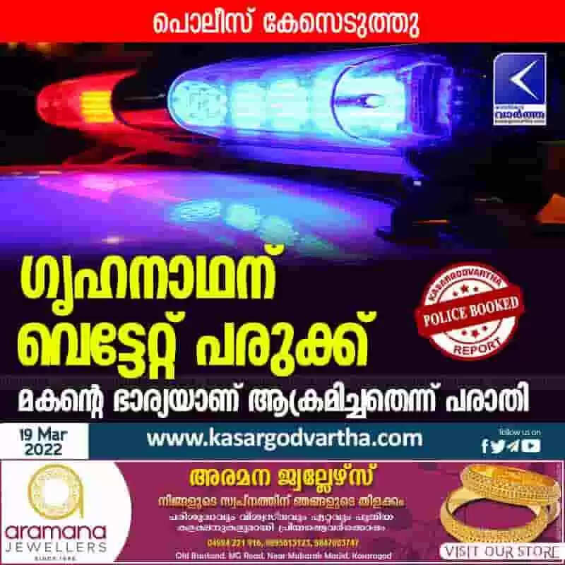 കാഞ്ഞങ്ങാട്: (www.kasargodvartha.com 19.03.2022) ഗൃഹനാഥന് വെട്ടേറ്റ് പരുക്ക്. മകൻ്റെ ഭാര്യയാണ് ആക്രമിച്ചതെന്നാണ് പരാതി. കള്ളാർ കുടുംബൂരിലെ ആനന്ദ (65) നാണ് കത്തി കൊണ്ട് വലതുതോളിന് വെട്ടേറ്റത്.
